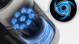 The lightweight HexaJet Motor delivers up to 280 watts of powerful suction across a variety of surfaces. Supported by nine Jet Cyclones and 27 air inlets, it works efficiently to maintain airflow, reduce suction loss, and trap fine dust — leaving floors and corners beautifully clean.