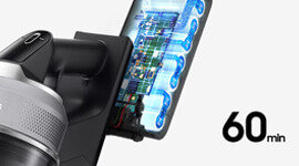 A high-capacity battery offers extended cleaning sessions, delivering up to 60 minutes of consistent suction. Move freely through your home without interruption, from room to room and surface to surface, all on a single charge, so you can clean with ease, not urgency.