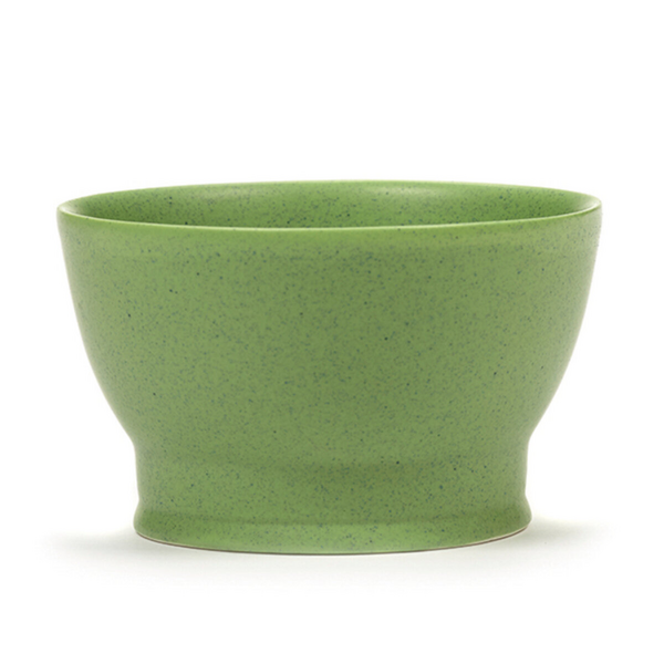 The fine plates of the Serax Ra tableware collection rest on a pedestal and literally elevate the food that is served on them. Cups and bowls are given a straight base and follow the same sculptural expression. A tall cake stand completes the collection. The tableware comes in three finishes: an off-white silk matt glaze; a black matt glaze with an off-white glaze interior; and a matt green that mimics the colour of old bakelite. The contrast between matte and glossy, black and off-white, are typical of the Ann Demeulemeester style.