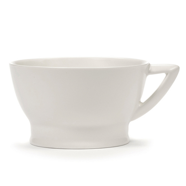 The fine plates of the Serax Ra tableware collection rest on a pedestal and literally elevate the food that is served on them. Cups and bowls are given a straight base and follow the same sculptural expression. A tall cake stand completes the collection. The tableware comes in three finishes: an off-white silk matt glaze; a black matt glaze with an off-white glaze interior; and a matt green that mimics the colour of old bakelite. The contrast between matte and glossy, black and off-white, are typical of the Ann Demeulemeester style.
