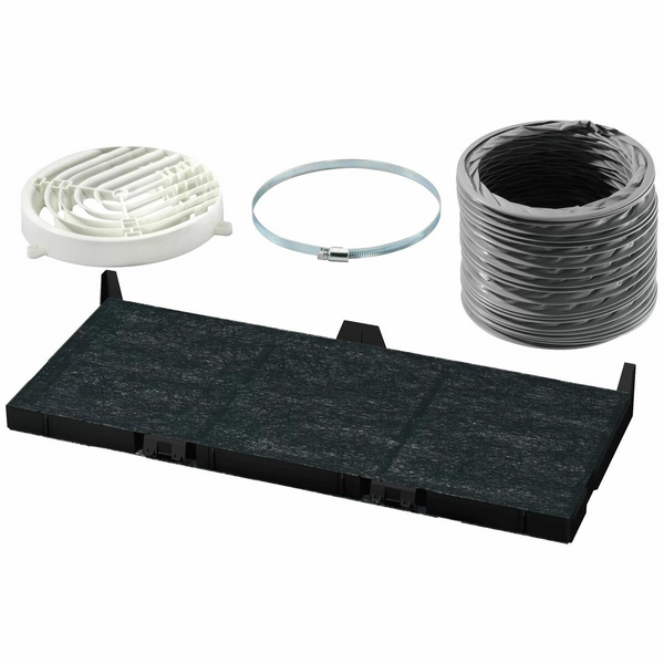 The Siemens Standard Recirculation Kit is designed for recirculation operation, providing a convenient solution for those who do not have access to external ventilation. This kit includes a charcoal cassette filter, deflector, flexible hose with a diameter of 150 mm and a length of 800 mm, along with two clamps and mounting material. The charcoal cassette filter helps to effectively remove odors and impurities from the air, ensuring a fresh and clean environment in your kitchen. The deflector helps to direct the airflow efficiently, while the flexible hose allows for easy installation and customization. With the included mounting material, you can securely attach the recirculation kit to your Siemens range hood. This recirculation kit is a practical addition to your kitchen appliances, providing an alternative ventilation solution that is both functional and reliable. Ensure a pleasant cooking experience with the Siemens Standard Recirculation Kit.