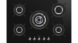| Features | Built-In Type: Ultra Low Profile or Fully Flushed. Cooktop Finish: Black Tempered Glass with a Straight Edge. Burner Finish: Matte Black Finish with Cast Iron Trivets. Ultra-Rapid Wok Burner: This large and versatile burner suits woks, pots, saucepans, and griddles. Control Knob Location: Front Stainless Steel Control Knobs. LP Gas Conversion Kit Included: Yes Flame Failure Safety Device: Yes Power Required: Yes, a 1200mm powercord is attached that operates the electronic Ignition. 5 x Cooking Zones: |