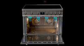 A smart cooling system directs airflow from the oven door to the cavity rear, ensuring even temperature management and enhancing performance and appliance longevity.