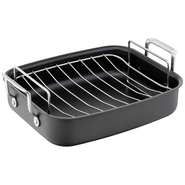 The hard anodised construction ensures this roaster will last a long time. Additionally, this roaster is equipped with sturdy handles to ensure safe handling when putting the roaster in and out of the oven.