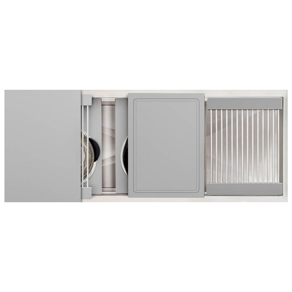 Stylish 16-Gauge Stainless Steel Fabricated in one piece with the highest quality stainless steel and TrueEdge Design. Angel Finish Custom hand-crafted finish for superior wear and easy maintenance. Hand-Crafted in the USA Each Galley is skillfully manufactured and carefully inspected in America. Versatile Double Tier Design Functionality on a whole new level! Accessories slide above and below each other on upper and lower tiers. Reversible Basin with Single Side Drain Maximizes usable storage under the sink. The sink can be installed with a right or left drain location. Drain Cover Our round Drain Cover conceals the drain while still allowing water to flow freely into the drain. DryDock Expand the functionality of your Galley without sacrificing under-counter storage or appliances by adding an 18 or 12 inch Built-in DryDock to either or both sides of any single or double bowl Workstation.