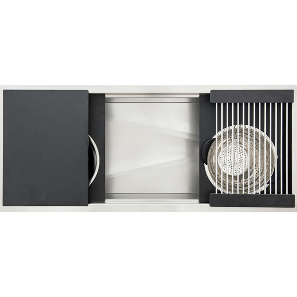 Stylish 16-Gauge Stainless Steel Fabricated in one piece with the highest quality stainless steel and TrueEdge Design. Angel Finish Custom hand-crafted finish for superior wear and easy maintenance. Hand-Crafted in the USA Each Galley is skillfully manufactured and carefully inspected in America. Versatile Double Tier Design Functionality on a whole new level! Accessories slide above and below each other on upper and lower tiers. Reversible Basin Single Bowl: Reversible Basin with Side Drain Drain Cover Our round Drain Cover conceals the drain while still allowing water to flow freely into the drain.