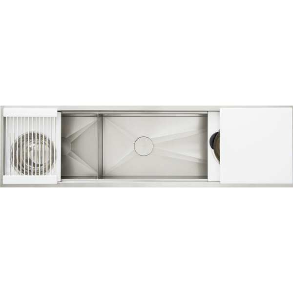 Stylish 16-Gauge Stainless Steel Fabricated in one piece with the highest quality stainless steel and TrueEdge Design. Angel Finish Custom hand-crafted finish for superior wear and easy maintenance. Hand-Crafted in the USA Each Galley is skillfully manufactured and carefully inspected in America. Versatile Double Tier Design Functionality on a whole new level! Accessories slide above and below each other on upper and lower tiers. Reversible Basin Double Bowl: Reversible Basin with 2 Bowls and 2 Drains Drain Cover Our round Drain Cover conceals the drain while still allowing water to flow freely into the drain.