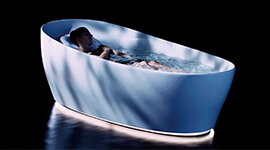 The bath is made from durable reinforced marble, giving it both a solid feel and a sleek finish that enhances its minimalist design. It’s complemented by a responsive electrostatic controller that responds to the lightest touch which makes adjustments simple, even mid-soak.