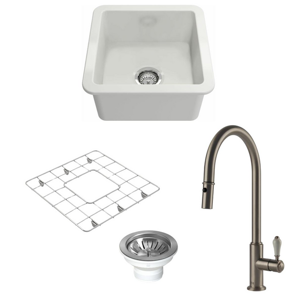 Turner Hastings Novi 60 Butler Sink Pack with Brushed Brass Ludlow Pull Out Mixer Tap and Accessories PKG025