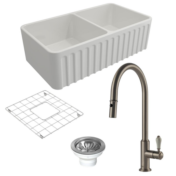 Turner Hastings Novi 85 Double Bowl Butler Sink Pack with Brushed Nickel Ludlow Pull Out Mixer Tap and Accessories PKG017