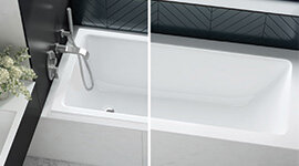The Kaldera bath is expertly engineered for flexible installation. A diamond-cut edge allows seamless inset or undermount placement, making it ideal for back-to-wall or corner layouts. This refined design approach enables you to create a cohesive, streamlined look that integrates beautifully with your chosen bathroom aesthetic.