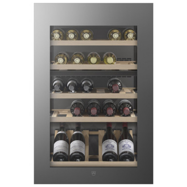 Elevate your wine experience at home with the V-ZUG WineCooler V400 90, perfect for preserving up to 38 bottles. Whether you love coming home after a long day and unwinding with a glass of perfectly chilled white wine, or entertaining guests over a bottle of red, this luxury wine cooler keeps your wine perfectly preserved. There are two zones inside the wine cooler, which can each be set at different temperatures. This allows you to separate different wine varieties so they are kept at the precise storage or serving temperature. Humidity is controlled inside the wine cooler, while specially-designed compressors and premium wooden shelves ensure a vibration-free environment. The stunning mirror glass front ensures this wine fridge effortlessly blends into any modern kitchen.