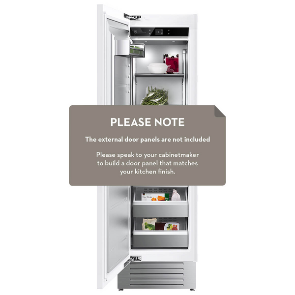 Its fully integrated form disappears effortlessly into bespoke cabinetry, maintaining the clean lines and curated calm of a timeless kitchen. Behind its understated façade lies a world of intelligent engineering. An intuitive touch display invites interaction, while interior lighting unveils a meticulously arranged space designed for effortless organisation.