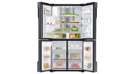 Long bar handles provide access into the interior, where wide shelving and in-door storage can accommodate all of your items. There are two FlexFresh crisper bins that enable you to organise and separate your fresh produce in humidity-controlled environments. The freezer sections both have their own door and the interior is neatly configured into easy-access drawers so you can find what you need without having to rummage through all your items.