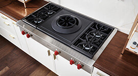 Designed for serious stir-fry enthusiasts, the powerful wok burner features a plumed flame that mimics traditional wok cooking. Paired with a cast-iron ring for round-bottom pans, it offers precise control and dynamic movement. This Wolf cooktop makes high-heat searing, gentle tossing, and angled cooking feel instinctive and effortless.