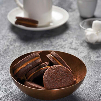 Using one biscuit, pipe on the Dulce de leche then with another biscuit press together.