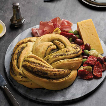 Using a dough scraper cut the log in half lengthwise. With the layers of pesto facing upwards, cross one half over the other to make an X. From the centre cross the left over the right, repeat towards yourself to create a braid. Return to the centre and repeat this braiding in the opposite direction.