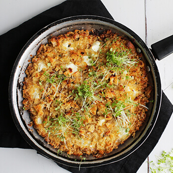 In a medium ovenproof frypan, over a medium heat, add the 20gm butter to melt, then pour in the egg and onions and cook for 3-4 minutes until the bottom is golden; crumble over the goat’s cheese, followed by the breadcrumb mixture. Place the frypan under grill and cook for 2-3 minutes until the breadcrumbs are golden and crisp and the egg is set. Serve topped with dressed salad greens