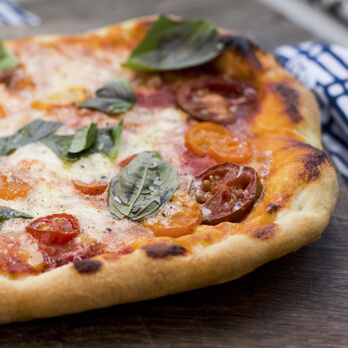 Heat your oven to 240C. Spread a little of the pizza sauce over the base and scatter with slices of bocconcini and tomatoes. Place the plate on the induction hob on bridge mode and blast on very high for 1 minute. Transfer the whole plate to the oven and bake in the oven for 6-10 minutes or until dough is golden and cooked.