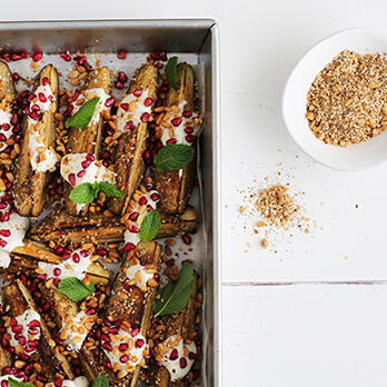 Dukkah roasted eggplant with mint and pomegranate - Preheat oven to 200°C Fan Assisted function.