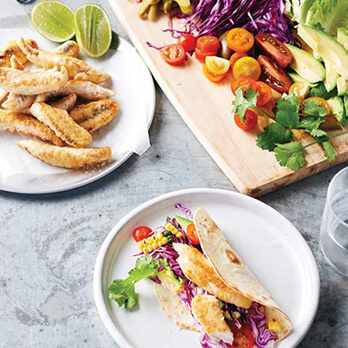 Heat a grill pan to high. Spray with oil and cook soft tacos for 30 seconds each side until coloured, serve on a plate. Place corn onto grill plate and allow to get some colour.
