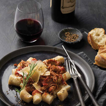 Place gnocchi into a serving dish, spoon over the tomato sauce and scatter across the shredded lamb. Garnish with fresh basil and parmesan.