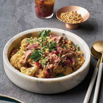 Roughly chop the cauliflower into chunks and pile into a warm serving bowl. Thinly slice the lamb and pile on top of the cauliflower. Add dressing, top with pine nuts and coriander leaves.