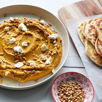 Place the pumpkin and garlic on a large baking tray and coat with 1 tbsp olive oil, season with salt and pepper and cook on the middle shelf for 25 minutes or until golden and tender, remove the skins from garlic and discard. Add the pumpkin and roasted garlic to a blender along with the chickpeas, tahini, lemon juice, cumin and remaining olive oil and blend until smooth. Season with salt and pepper and transfer to your serving dish, crumble feta on top, sprinkle with pine nuts and sumac and finish with a drizzle of extra virgin olive oil. Serve with warm yoghurt flatbreads.