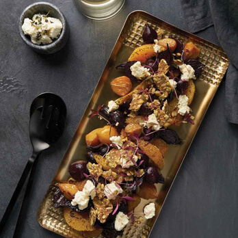 Arrange roasted beetroot, fresh orange segments and Persian fetta onto a serving platter or bowl. Spoon over the dressing and sprinkle with chunks of the savoury granola. Serve warm or cold.