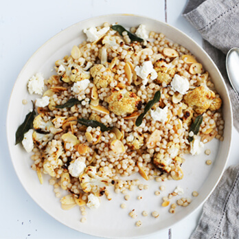 Coat the cauliflower with the oil, season with salt and pepper and spread out on a baking tray, roast for 25-30 minutes until golden and cooked. Meanwhile, cook the pearl couscous in salted boiling water for about 5-7 minutes until tender, drain and set aside.