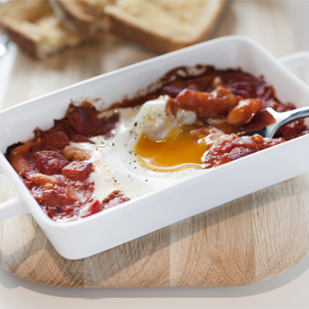 Place 4x2 cup oven proof ramekins or dishes onto a baking tray. Divide the sauce between the dishes. Press the sauce with the back of a spoon to create two indents in each dish. Carefully crack an egg into each indent.