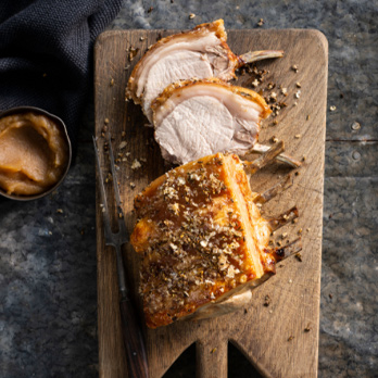 11. Remove foil from the roast, slice 1 bone per person, garnish and serve with smoked apple sauce