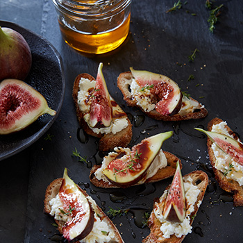 Spread a generous amount of ricotta onto each crostino; top with two fig slices, drizzle with honey and vino cotto mixture and sprinkle with remaining thyme. Sprinkle with extra salt and pepper if desired. Drizzle with more honey if desired.