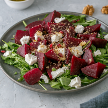 To serve, place the rocket leaves in a large serving bowl. Add around 1 tbs of the dressing and toss to just coat. Add the beetroot pieces and walnuts on top of the rocket. Crumble over the goat cheese. Top with the pomegranate and drizzle with extra dressing as desired.