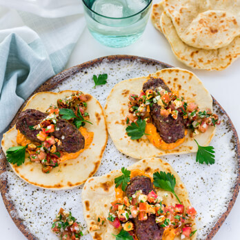- Heat a teppanyaki, grill plate or large frypan over medium heat. Cook flat breads for 1-2 minutes a side until golden and heated. Set aside and cover with a clean tea towel to keep warm. Lightly brush cevapcici with olive oil and grill for 8-10 minutes, turning, until cooked through.