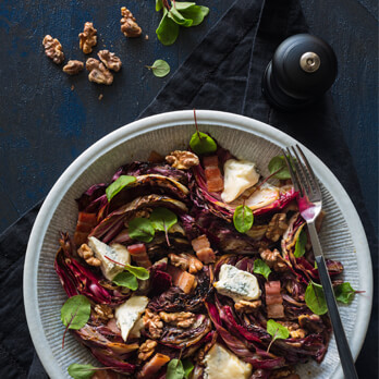 - Remove the core from the radicchio, separate the leaves then arrange on serving platter. Scatter over the pancetta, gorgonzola, walnuts and drizzle over remaining dressing.