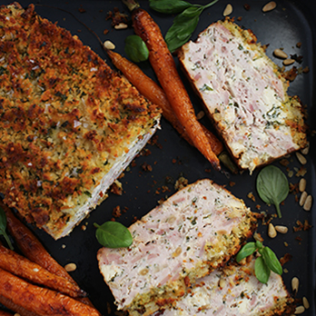 In a frypan over medium heat, add the oil, bacon and onion and cook for 5 minutes, or until the onion is soft and the bacon renders its fat, add the garlic and cook for one minute, transfer to a large bowl. Add the chicken mince, cream cheese, lemon zest, pine nuts, salt and pepper, and basil; mix well to combine but a few larger bits of cream cheese scattered throughout are ideal. Fill the loaf tin with the chicken mixture, pushing it into the corners and smooth the top - I find using clean wet hands are the best tools here.