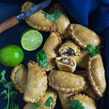 - Fold pastries in half so you have a crescent shape and crimp the edges together. Transfer empanadas to a baking tray lined with baking paper and brush with egg wash and bake for 25-30 minutes until golden brown.