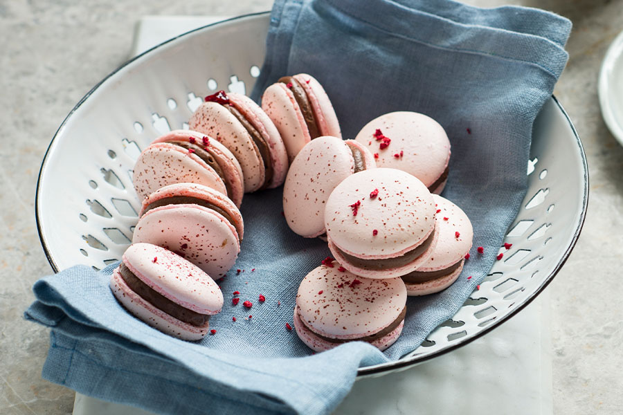 12. Spoon the mixture into a piping bag fitted with a 7mm round nozzle. Holding the piping tip about 1cm from the baking tray, pipe 3.5cm rounds onto the lined trays. Sprinkle each macaron lightly with the freeze-dried raspberries. Set aside at room temperature until a skin forms on the surface of the macarons. (This can take from 20 minutes to an hour depending on the humidity). The skin should have a matt appearance and be dry enough that it does not stick to your finger when touched lightly.