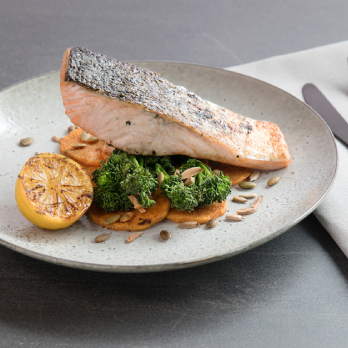 Serve the sweet potato slices on a plate topped with broccolini, salmon and sprinkled with nuts and seeds. Squeeze over the grilled lemon and drizzle with a little extra virgin olive oil to serve.