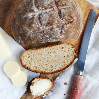 lace the dough onto a heavy-based tray, if not already, and with a very sharp knife or razor, make 4 cuts in the top of the dough in a square shape. Place a baking sheet in the oven on the bottom rack (underneath where the bread will bake) and allow it to heat up. Put the dough in the oven and put the ice cubes in the empty tray beneath and quickly shut the oven door. This will trap all the steam in the oven and allow the bread to rise before the crust begins to form. Bake for 20 minutes then reduce the temperature to 180°C and bake for a further 20 minutes. Transfer to a wire rack to cool completely before slicing.