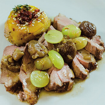Add the Chestnuts, pomegranate molasses, saffron and butter. Cut the grapes in half and add. Briefly bring the sauce to a boil. Season to taste with salt and a little pepper.