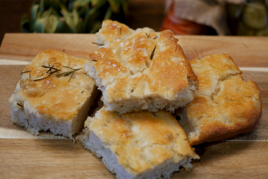 9. Once the second prove is finished, drizzle more oil over the top and sprinkle with salt and other toppings (rosemary, olives, sun dried tomatoes, grapes, thyme, garlic).