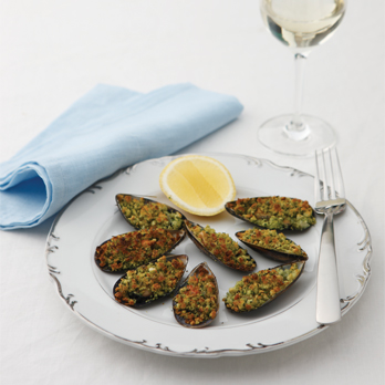 Place mussels on an oven tray, spoon over breadcrumb mixture and drizzle with olive oil.