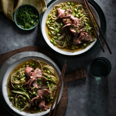 This is a delicate but satisfying warm meal. In summer you can also serve the noodles and broth chilled, topped with the warm roast beef for a refreshing light summer meal.