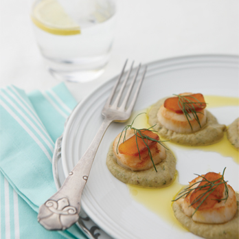 To serve, arrange three teaspoons of fennel puree on each plate and top with the scallops finishing with a slice of bottarga*.