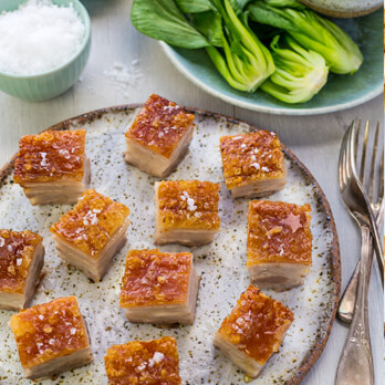 - Baste the pork with the pan juices and return to oven for a further 20-30 minutes. Rest pork for 15 minutes. Place pork skin-side-down on a board and cut into bite-sized cubes. Serve pork with steamed rice, bok choy and extra sauce.