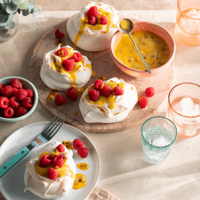 - To serve, place pavlovas onto individual serving plates; spoon over a small amount of curd; dollop a generous amount of raspberry mascarpone cream over curd, then dollop with more curd. Garnish with a raspberry and mint to serve.