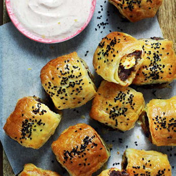 In a small bowl, mix harrisa with yoghurt and season with salt and pepper. Serve alongside the hot sausage rolls.