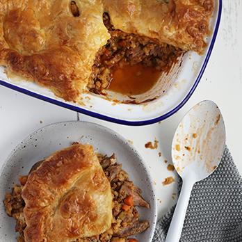Add the pearl barley and vinegar and return to the oven to cook for 35-40 minutes until the pearl barley is cooked and the sauce has reduced, add the lamb to the pot and mix gently to combine. Pour into a greased 32x24 cm pie dish and cover with the puff pastry, make 2 slits in the centre of the pastry, crimp the edges and brush with the egg. Bake for 15 minutes until the pastry has risen, then reduce the temperature to 180°C and cook for a further 25 minutes.